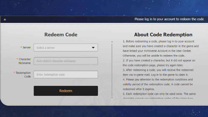 Pemain dapat menukarkan kode di situs penukaran resmi game tersebut. Cukup login dengan akun HoYoverse Anda dan masukkan server Anda, nama karakter, dan kode penukaran yang valid untuk mengklaim hadiah gratis.